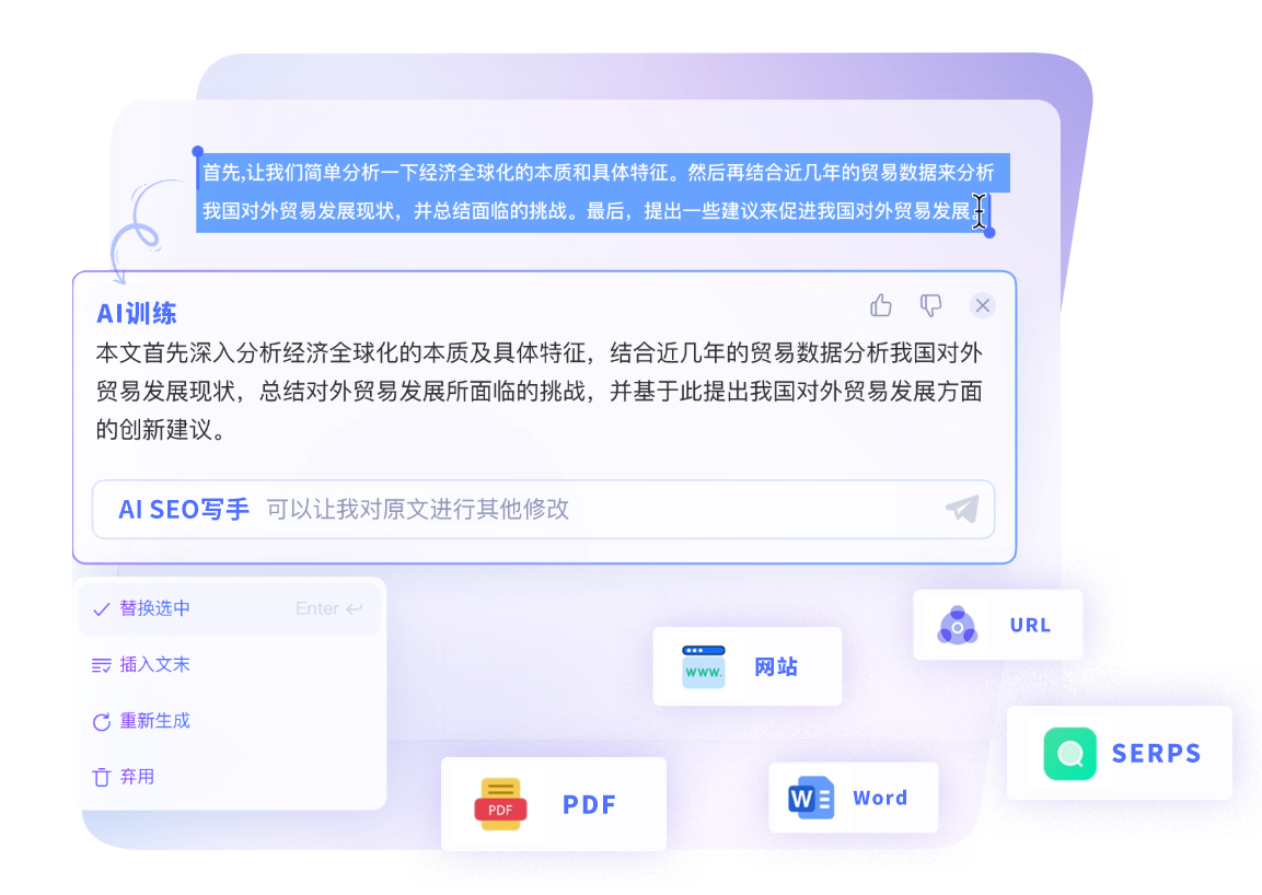 可以使用各种类型的文档、网站内容、竞品内容等各种资料对AI进行训练,把AI训练成您的专属“文案编辑”,创作高质量的SEO/GEO文章